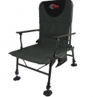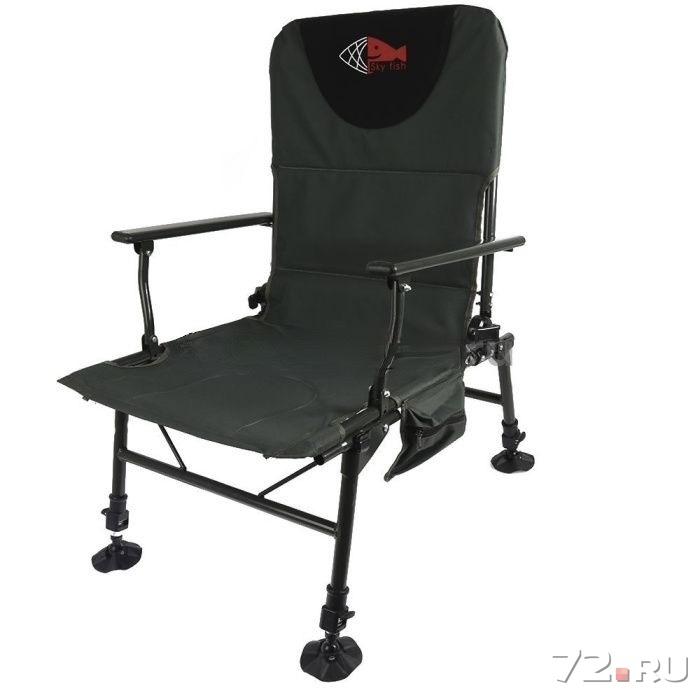 SkyFish - комфортное, раскладное кресло, которое станет незаменимым атрибутом на рыбалке. Конструкция кресла весьма прочная, рама изготовлена из легкого, металлического сплава, синтетическая ткань спинки и сиденья — износоустойчивая (оливкового цвета), подлокотники выполнены из ударопрочного пластика. Используя выдвижные ножки телескопической конструкции можно быстро выставить нужный уровень сиденья независимо от места лова. В результате, кресло всегда будет стоять ровно — на наклонной дамбе, каменистом побережье или на склоне реки. Благодаря шарнирно прикрепленным к ножкам широким пяткам, кресло можно устанавливать даже на мягком грунте, ножки не будут в него проваливаться. Самозажимные фиксаторы надежно удерживают ножки в выдвинутом положении. Вдобавок, кресло способно трансформироваться в удобный лежак. Наклон спинки регулируется в широких пределах, что дает возможность выбрать оптимальное положение. В сложенном состоянии кресло занимает мало места. Кресло SkyFish станет отличным выбором, как для фидера и поплавочной ловли, так и для отдыха на природе.