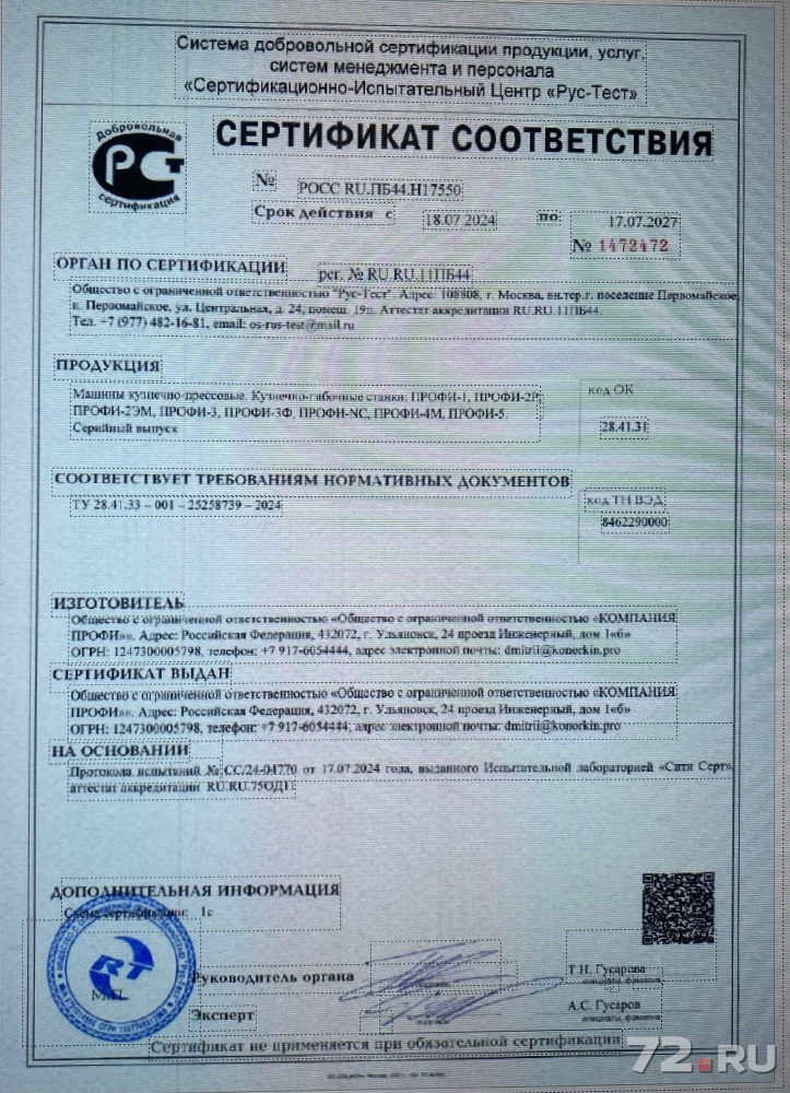 Кузнечно-гибочный станок «ПРОФИ-1» сертифицирован и за декларирован в Росаккредитации.